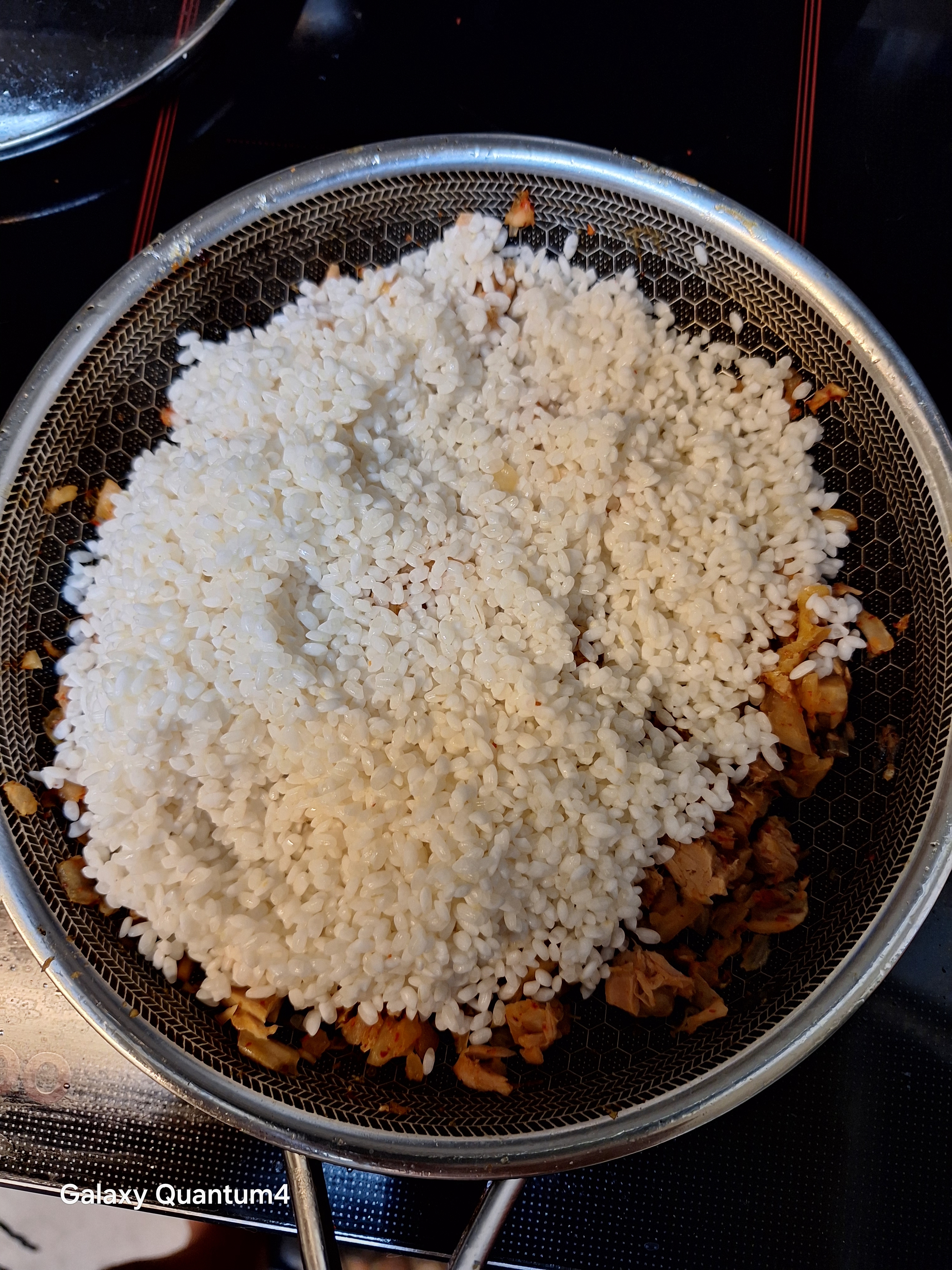 (4) 김치, 대파, 참치 볶은후 그위에 불린쌀을 넣고 볶아준다.
